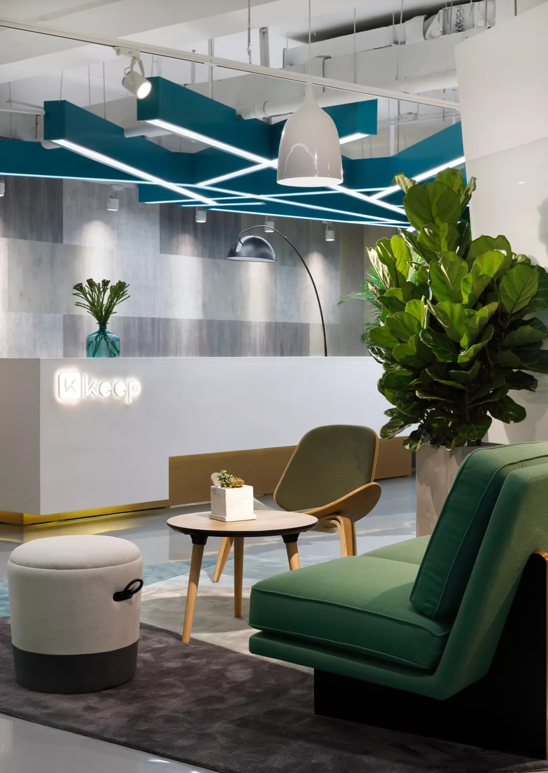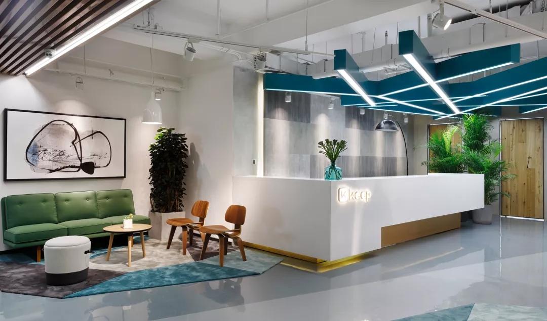 靠近電梯入口的前臺(tái)通過頂部的放射狀線條設(shè)計(jì)產(chǎn)生視覺延伸感,兩側(cè)區(qū)域通過軟裝陳設(shè)實(shí)現(xiàn)多層次的空間,靈活滿足接待、等候、會(huì)議及咖啡茶點(diǎn)的各種需求,員工和來訪人員各取所需互不干擾。
