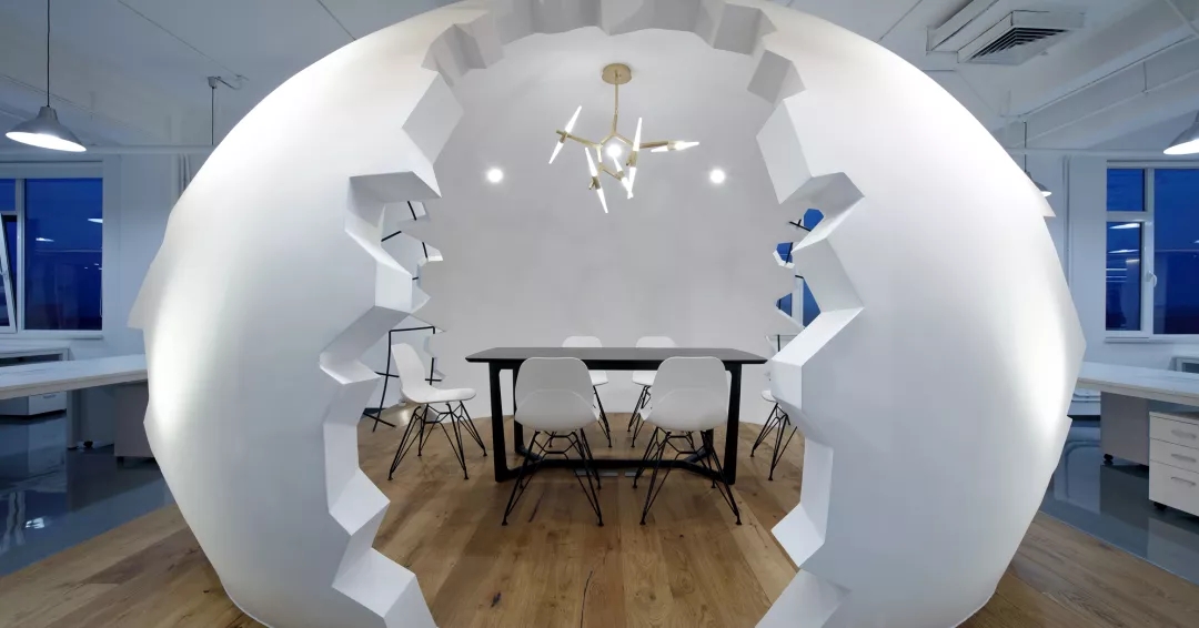 為了給開放式的辦公空間注入活力,我們?cè)谂排抛墓の粓?chǎng)地正中設(shè)置了“破殼而出“的主形象——巨蛋討論區(qū),橢圓形的蛋壁實(shí)現(xiàn)攏音的隔音效果,兩側(cè)的鏤空引入自然光源,令這個(gè)裝置藝術(shù)般的討論區(qū)打破開放式工位的沉悶,成為視覺焦點(diǎn)。