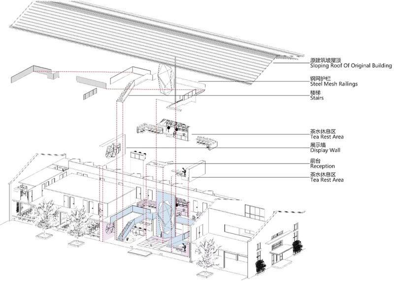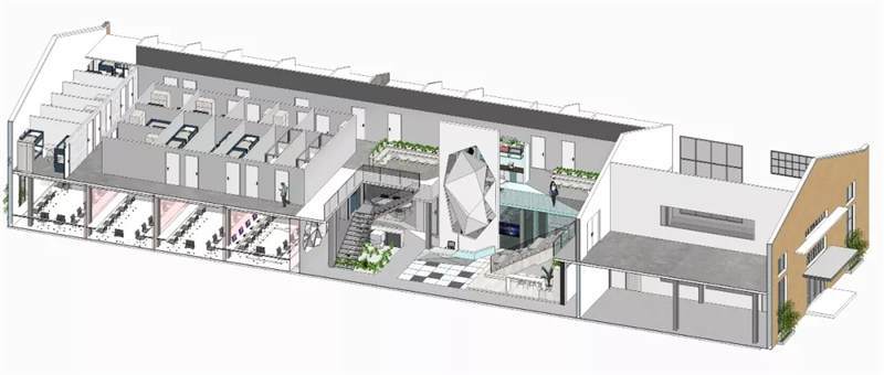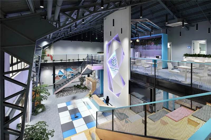 本案位于上海市寶山區(qū)蘊(yùn)川路6號(hào)智慧灣科創(chuàng)園,原建筑為3D打印的廠(chǎng)房裝修,室內(nèi)最高凈高9米,最低6.4米。此空間除原建筑結(jié)構(gòu)墻外,無(wú)任何結(jié)構(gòu)柱與墻體,因此為了更充分合理的利用空間,設(shè)計(jì)師構(gòu)筑了二層,根據(jù)嗶哩嗶哩電競(jìng)的辦公功能訴求,布置空間功能區(qū),即1F分布前臺(tái)區(qū)、會(huì)議區(qū)、茶水接待區(qū)、賽訓(xùn)室、開(kāi)敞辦公區(qū)、導(dǎo)播室。2F分布就餐區(qū)、住宿區(qū)、導(dǎo)播室等空間。