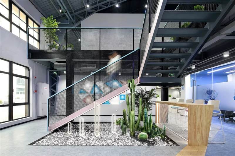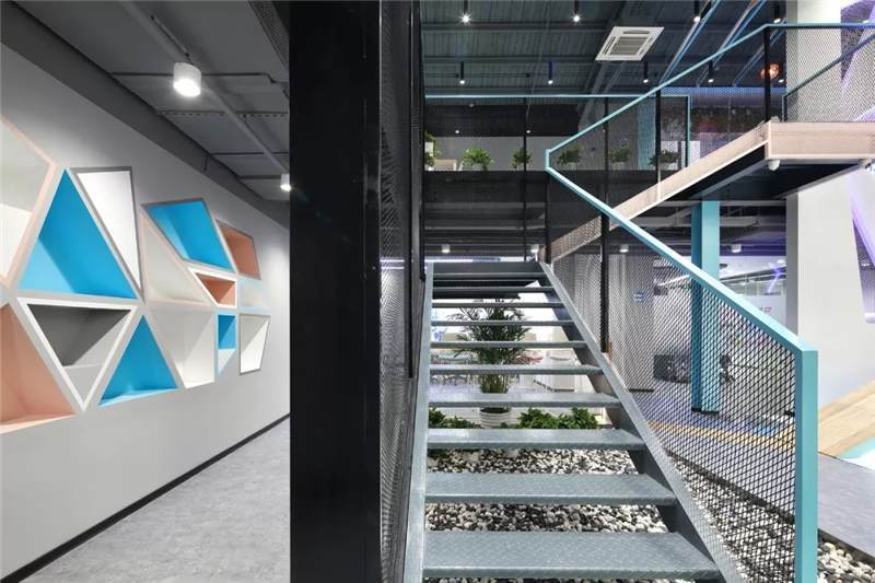 前廳左側(cè),設(shè)計(jì)結(jié)構(gòu)簡(jiǎn)單的樓梯,運(yùn)用與二層欄桿材質(zhì)相同的鐵絲網(wǎng)扶手,使得兩層樓形成一個(gè)工業(yè)風(fēng)的整體。側(cè)邊與扶手點(diǎn)綴以藍(lán)色和粉色的噴漆,樓梯下布置用鵝卵石,仙人掌和燈光組成的景觀裝置小品,讓整個(gè)電競(jìng)空間生機(jī)勃勃,平添許多年輕活躍的氛圍。此處木飾面的吧臺(tái)延伸到地面再與前臺(tái)、右側(cè)大臺(tái)階連接形成一個(gè)整體,使整個(gè)空間更加連貫統(tǒng)一。
