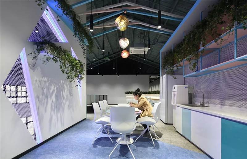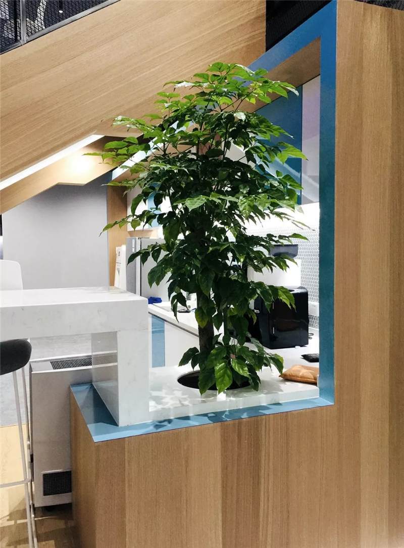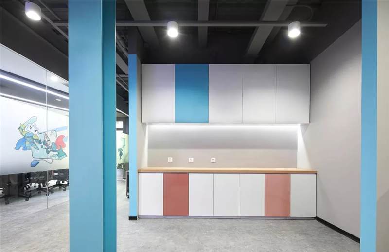 吊柜打破了傳統(tǒng)的平開(kāi)門(mén)形式,使用開(kāi)放的彩色盒子,實(shí)用兼裝飾功能。另外設(shè)計(jì)師還根據(jù)層高差,在茶水區(qū)頂部設(shè)計(jì)三角形格柵,茶水柜上方及背景墻后方,點(diǎn)綴綠植,使整個(gè)空間富有生態(tài)氣息,在光影的效果呈現(xiàn)別樣風(fēng)采。