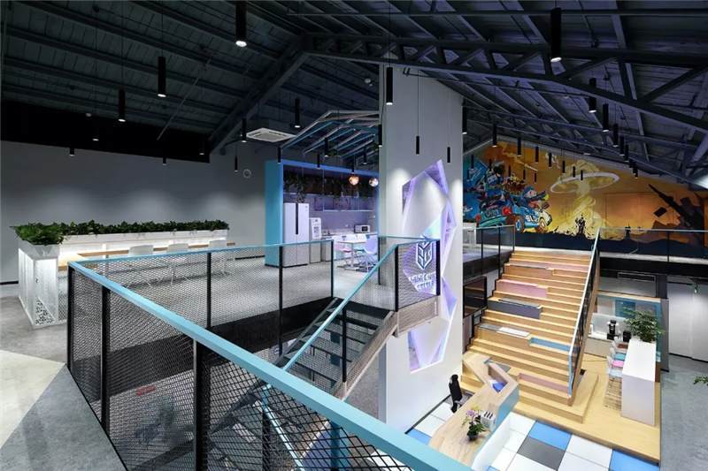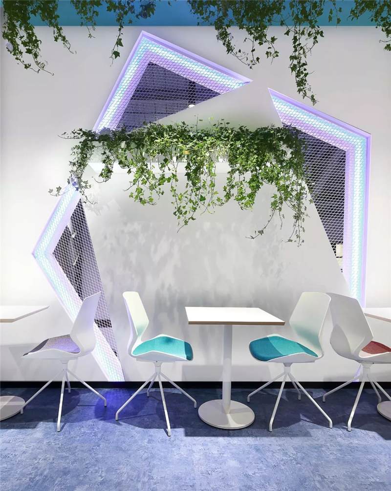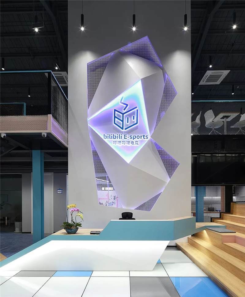 前臺(tái)接待區(qū)利用建筑結(jié)構(gòu)挑空空間的優(yōu)勢(shì),塑造9米高的具有未來(lái)雕塑造型藝術(shù)感的LOGO背景墻,結(jié)構(gòu)形態(tài)上,設(shè)計(jì)師運(yùn)用B站文化中的創(chuàng)意與元素,中間由三維立體幾何造型與鐵絲網(wǎng)拼接而成,配以藍(lán)色燈光,彰顯公司文化的同時(shí)呈現(xiàn)電競(jìng)的科技感,使得整體背景墻,體量和形態(tài)上給往來(lái)訪(fǎng)客和員工強(qiáng)烈的視覺(jué)沖擊感。
