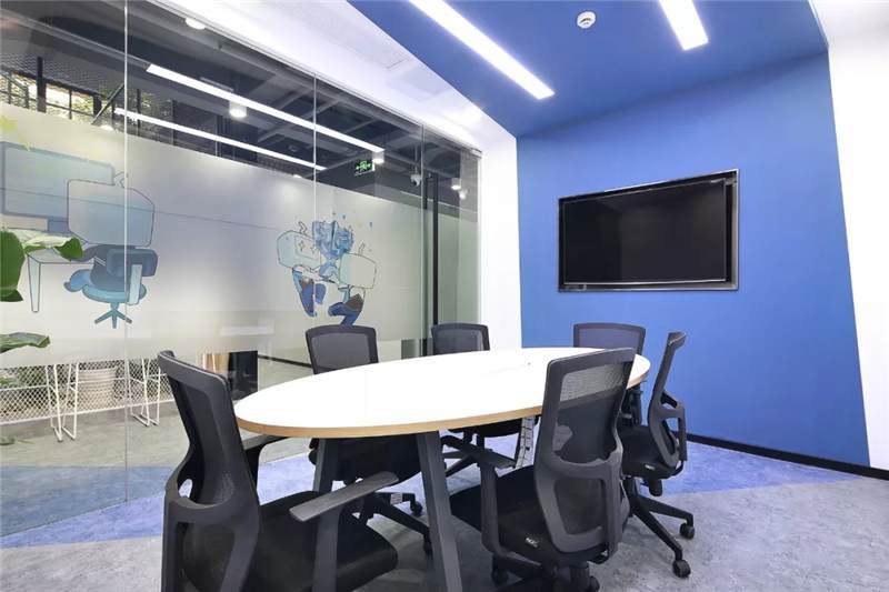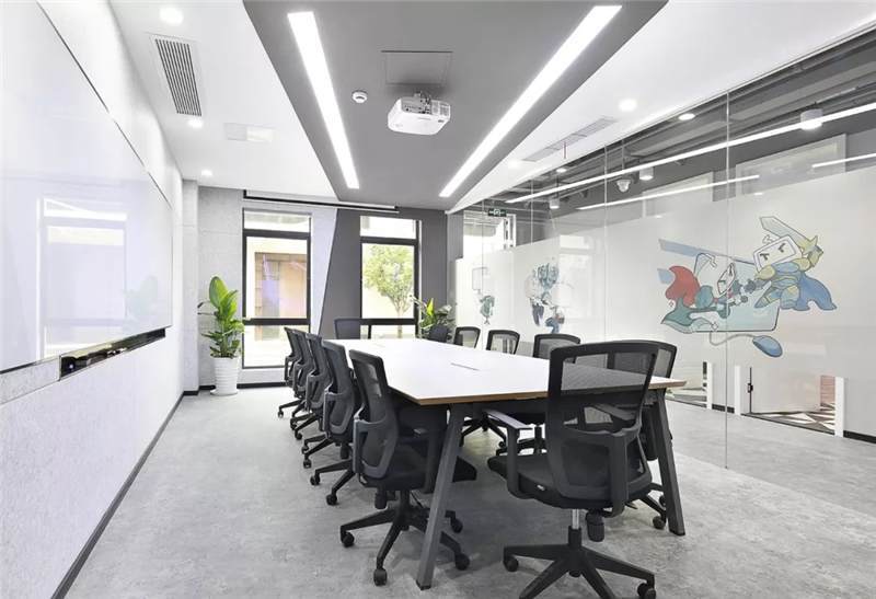 開(kāi)放辦公區(qū)主體用大量的白色,更加干凈、簡(jiǎn)潔;頂面燈具使用粉色,與其他區(qū)域相呼應(yīng);地面采用兩種地膠拼接,也使得空間更加有層次感。大小不同的會(huì)議空間設(shè)計(jì),運(yùn)用了天花到墻面再到地面的連貫造型,增加整個(gè)會(huì)議空間的靈活性。
