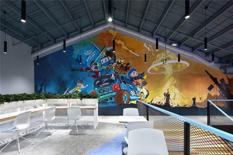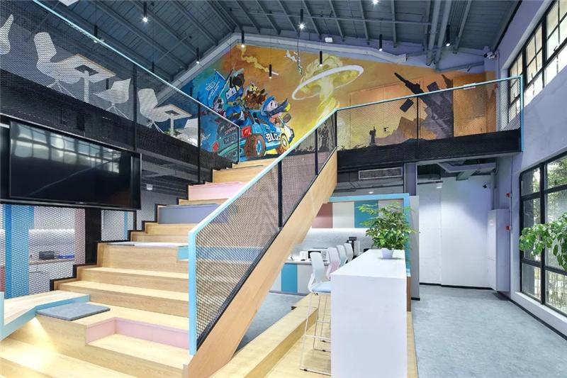 二層大臺(tái)階入口處設(shè)計(jì)師設(shè)置醒目的電競(jìng)主題手繪圖,巧妙的把原本的雙開(kāi)門(mén)變成隱形門(mén),墻內(nèi)部為電競(jìng)導(dǎo)播室。手繪圖豐富的色彩,突出的電競(jìng)主題,卡通的形象,把BILIBILI的風(fēng)格呈現(xiàn)的淋漓盡致。