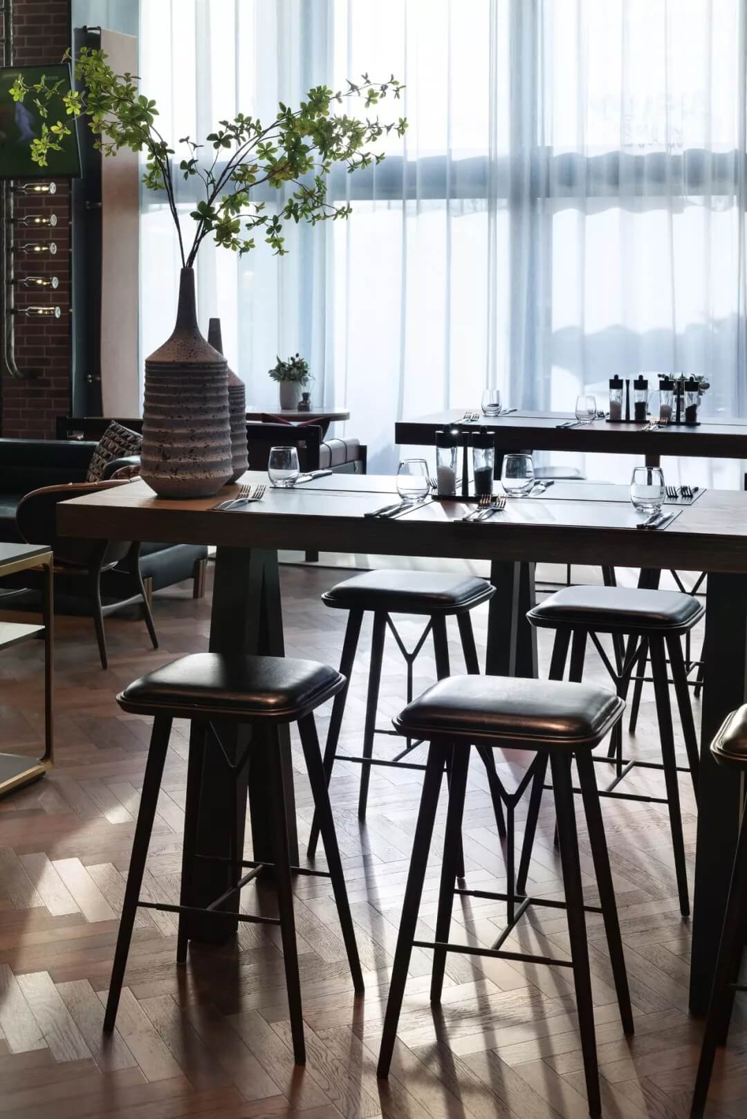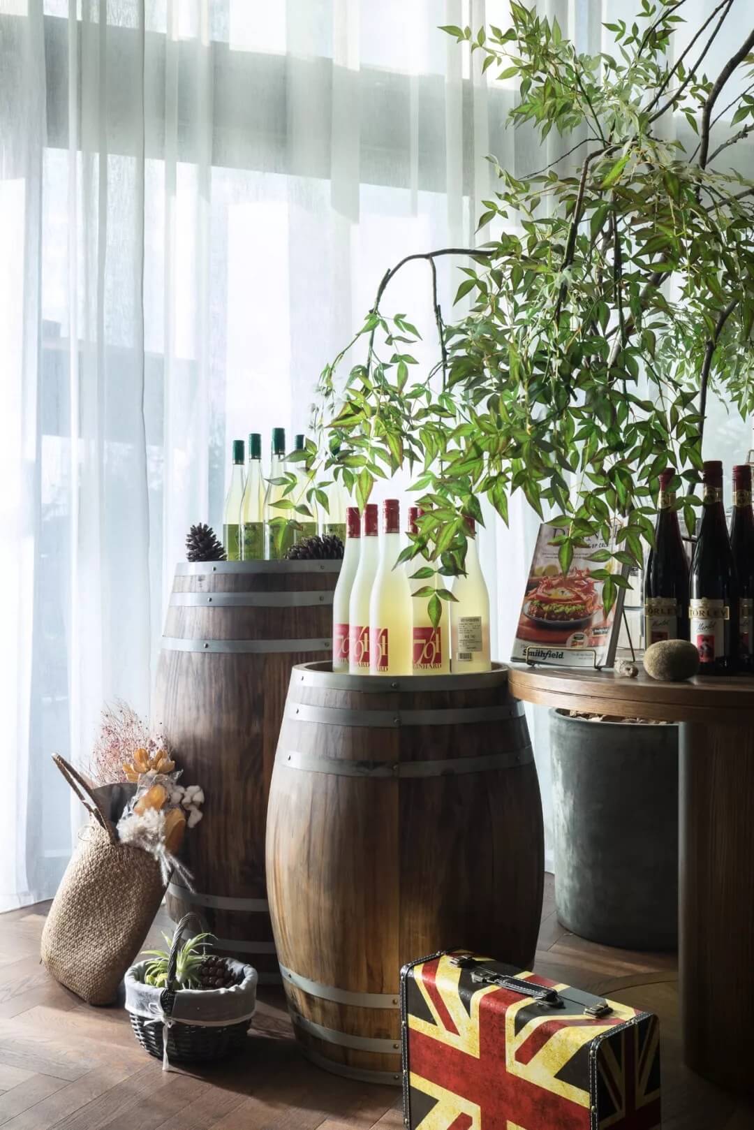 自然的青翠綠意與質(zhì)樸的啤酒桶木藝氣質(zhì)互融,靈韻交加,酒香沁人,不加過多修飾地圍合出一隅相對靜謐的臨窗休閑區(qū)。在這里,設(shè)計透過落地玻璃窗的相隔將內(nèi)外視域完全打開,陽光傾灑進(jìn)來,引入截然不同的清新與濃密的自然舒適度,外在景觀與內(nèi)在布設(shè)氣質(zhì)相合。