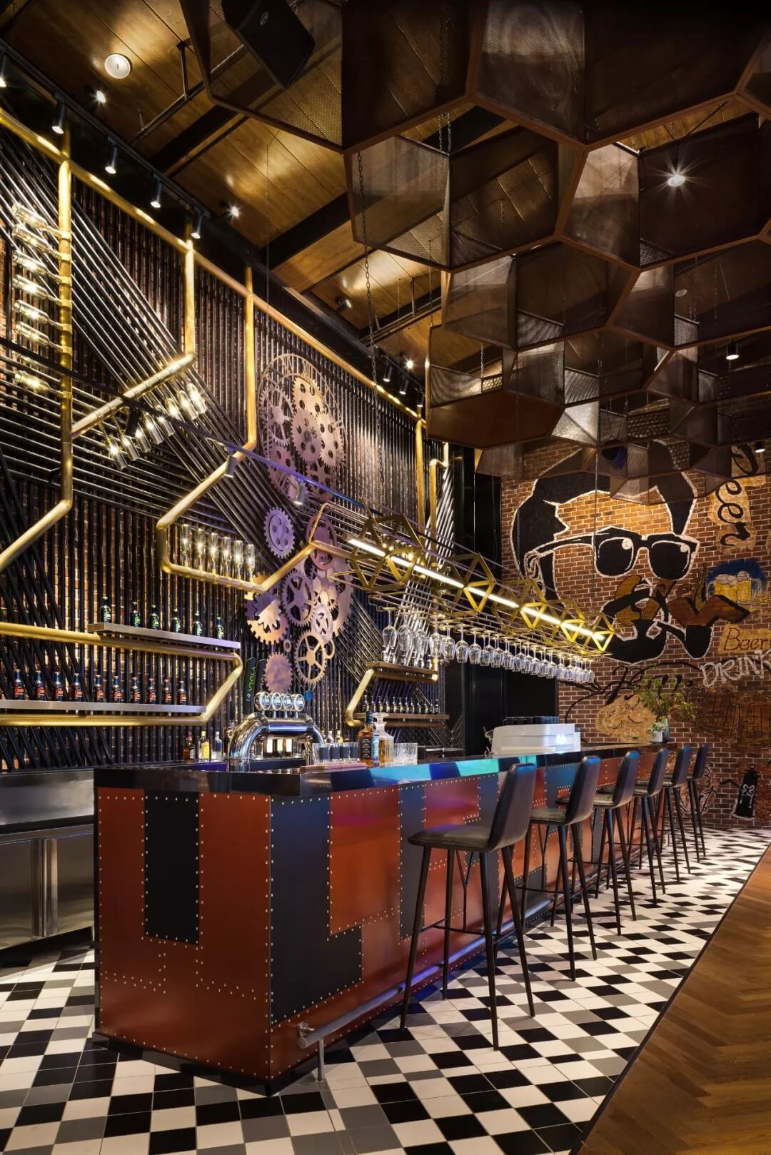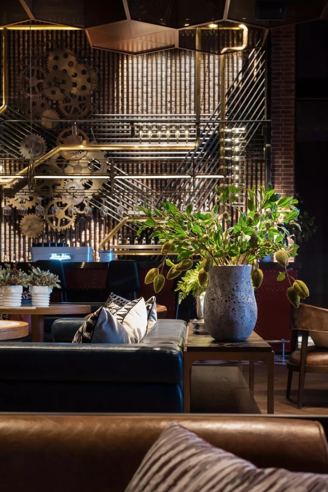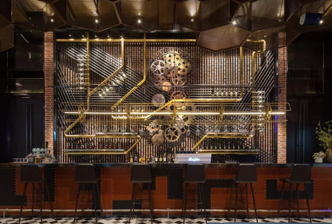 工業(yè)風(fēng)的精髓在于,在原空間樸拙素簡的本真狀態(tài)下延展其自由隨性的氣質(zhì),在粗獷的空間架構(gòu)中消解拘束感,呈現(xiàn)出大氣又不失細(xì)膩的美感。粗礪的紅磚墻、朋克夸張的墻畫涂鴉、裸露的管道線路、復(fù)古做舊的齒輪掛件、紅黑交接的鉚釘吧臺......統(tǒng)攝進(jìn)工業(yè)風(fēng)的設(shè)計常規(guī)之中。