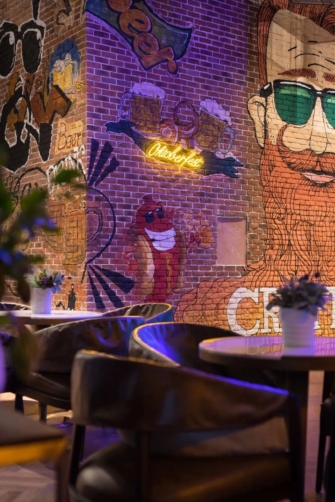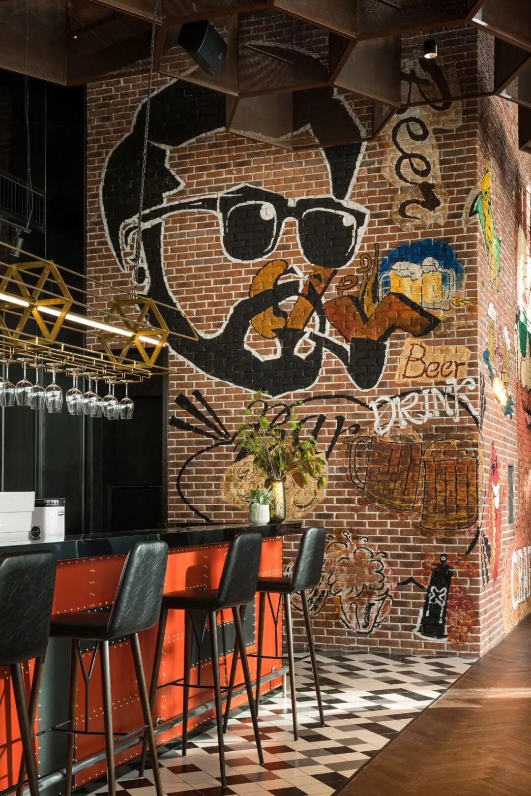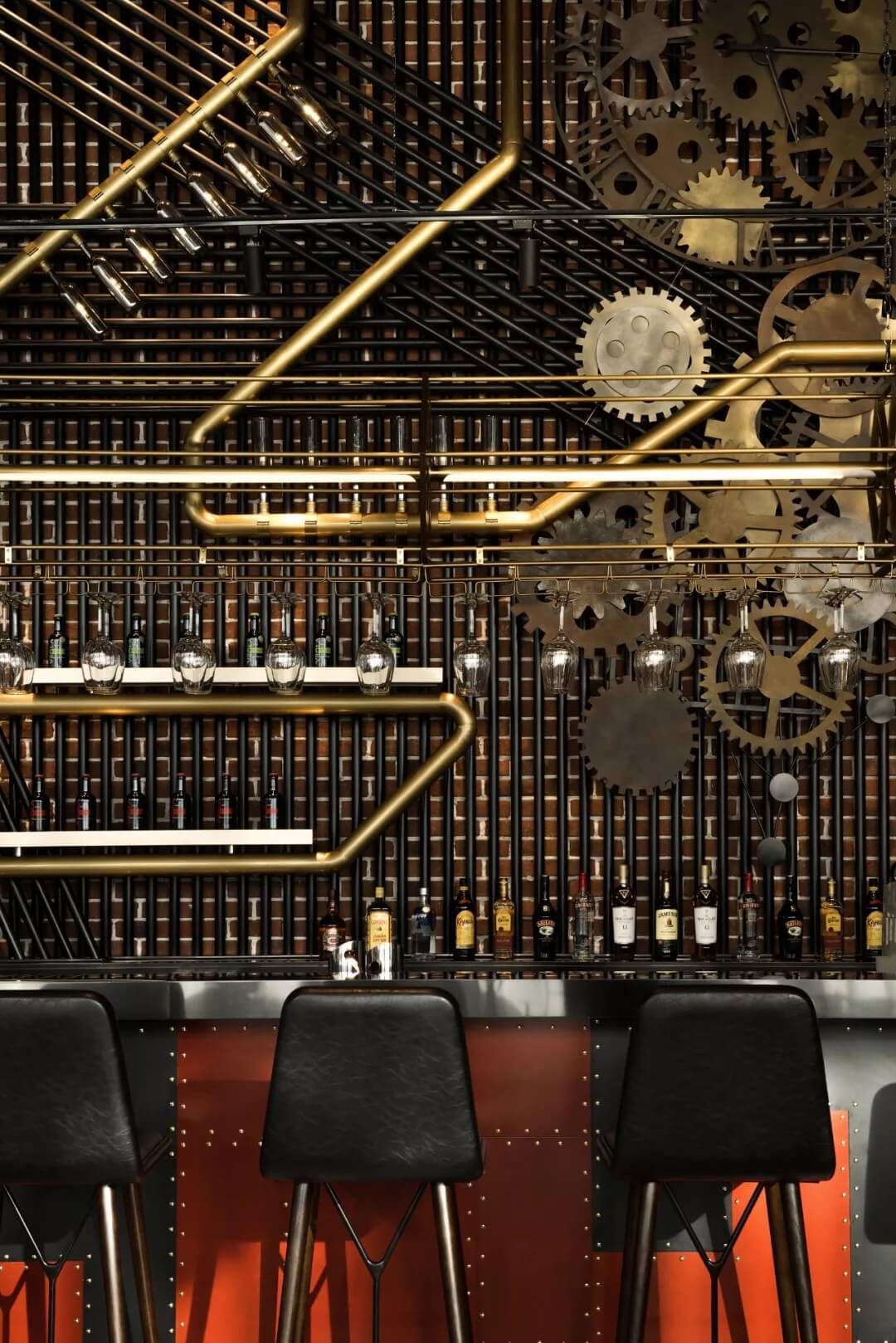 工業(yè)風(fēng)的精髓在于,在原空間樸拙素簡的本真狀態(tài)下延展其自由隨性的氣質(zhì),在粗獷的空間架構(gòu)中消解拘束感,呈現(xiàn)出大氣又不失細(xì)膩的美感。粗礪的紅磚墻、朋克夸張的墻畫涂鴉、裸露的管道線路、復(fù)古做舊的齒輪掛件、紅黑交接的鉚釘吧臺......統(tǒng)攝進(jìn)工業(yè)風(fēng)的設(shè)計常規(guī)之中。