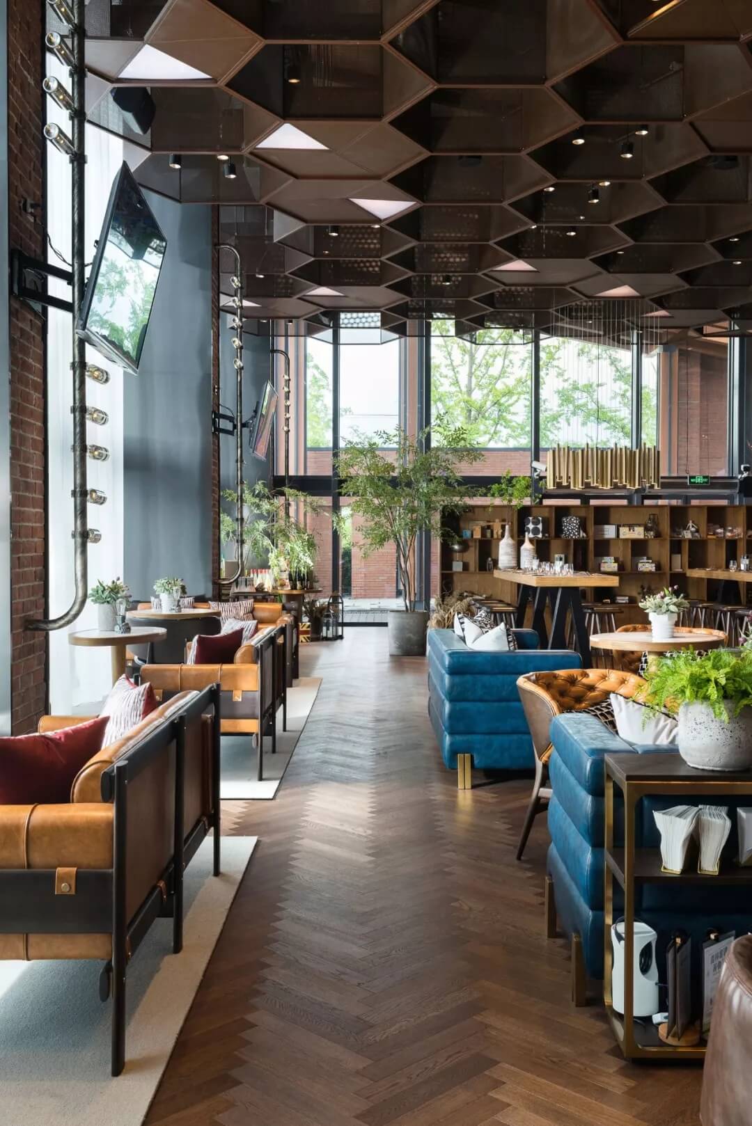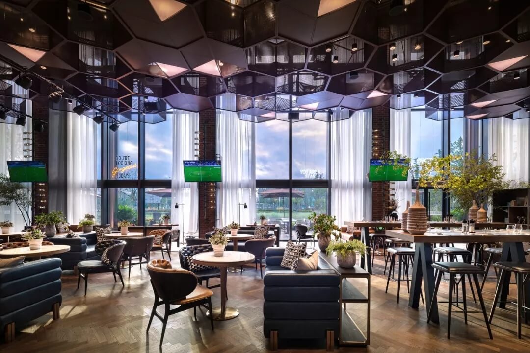 設(shè)計將足球的六邊形化用于天花的裝飾上,立體幾何的體量、金屬線條的質(zhì)感賦予了社交空間的適當(dāng)距離感。多幅大屏幕的配置,讓聚于此的人們,沉浸于啤酒吧和比賽現(xiàn)場的氛圍當(dāng)中,盡情享受在開闊大氣的空間格局中觀摩賽事的自由,為熱愛喝彩,為夢想干杯,傳遞運(yùn)動不止的精神。