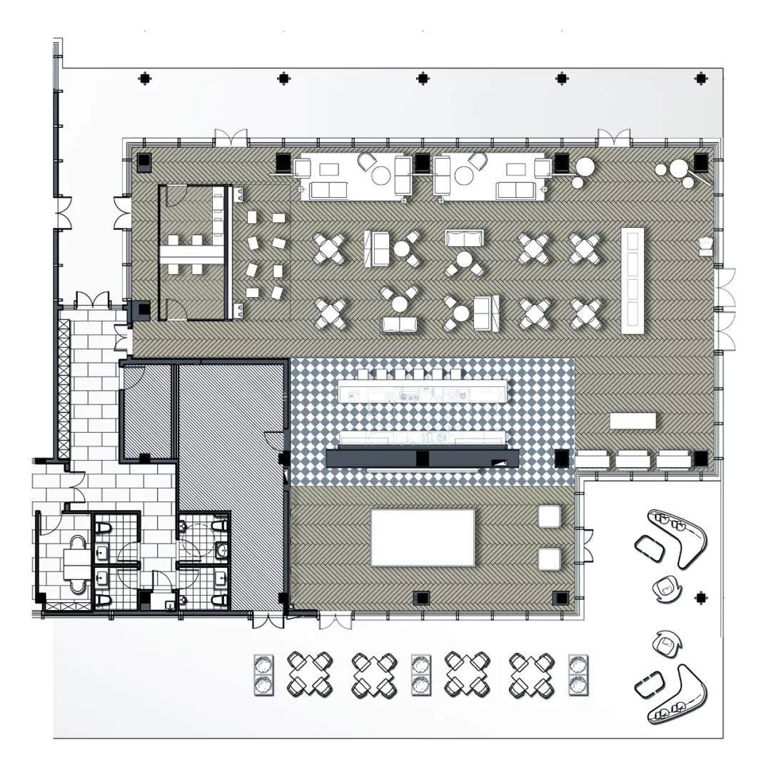 空間中所有符號語言均是設(shè)計的表象表達(dá),與其深邃豐富的內(nèi)在視像緊密相連。未經(jīng)修飾的混凝土、鋼材料與金屬組件透露出粗獷與質(zhì)樸的氣質(zhì),長條燈飾融進(jìn)鐵藝管道的線條穿插中,以光影效果加強(qiáng)幾何美學(xué)里的明暗層次,在硬朗中體現(xiàn)熱情與溫暖,點染酒吧一隅的休閑氛圍。